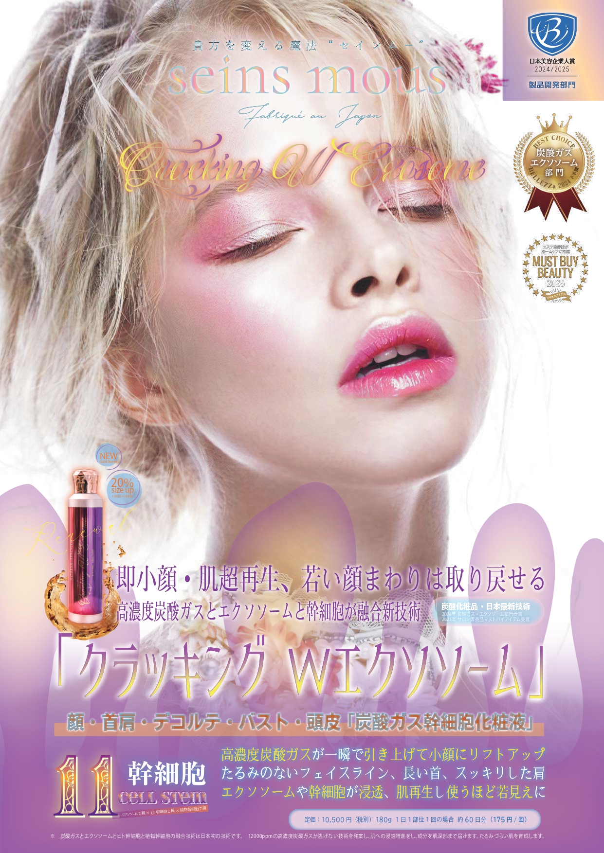 自社研究所を設立し、CEO自らが研究員として試作・検証に取り組むことで、ボーテロンド、クラッキングWエクソソーム、シャンパーニュカーボンなど、結果と安全性にこだわった革新的製品を次々に生み出しています。これらの取り組みは、日本美容企業大賞・製品開発部門(2024/2025)でも連続受賞するなど、高く評価されています。